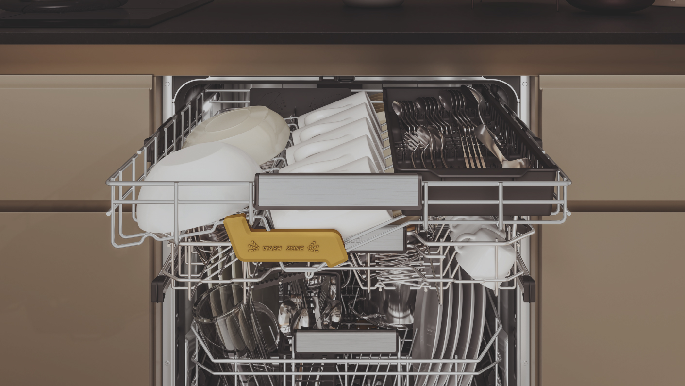 De ruime MaxiSpace kuip biedt 10%* EXTRA RUIMTE: er blijft geen vuile vaat meer achter op het aanrecht! Plaats extra grote borden tot wel 32 cm in het onderste rek. Het unieke derde rek biedt plaats aan kopjes, kommen en hoge glazen en is voorzien van geïntegreerde waterstralen.