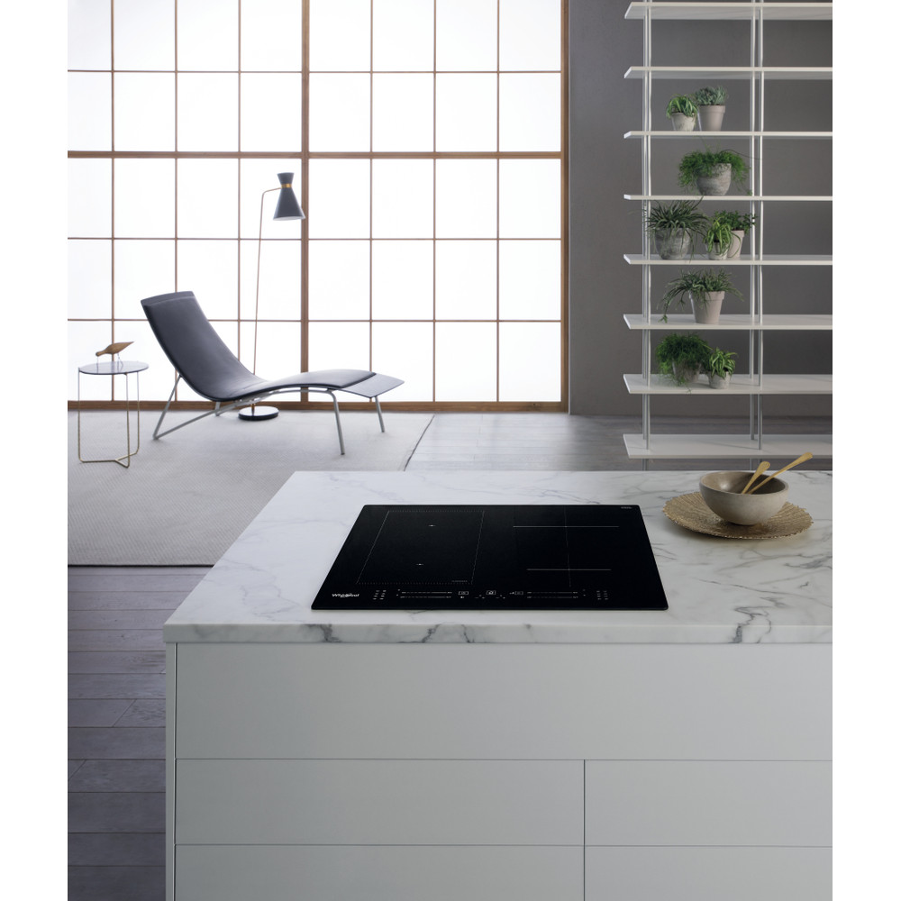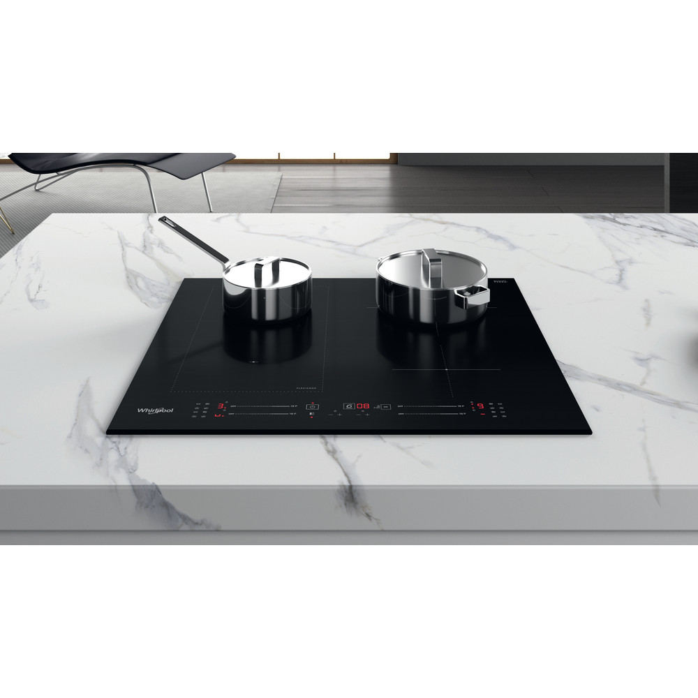 4 inductiezones. flexiCook technologie laat u meerdere pitten tot één zone samenvoegen, ideaal voor grotere potten en pannen. Intuïtieve schuifregelaar, voor moeiteloze bediening van de apparaatinstellingen. Kenmerken van deze Whirlpool inductiekookplaat: Een elegante technologie die de pan en niet de kookplaat verwarmt, energieverspreiding beperkt en perfecte kookresultaten biedt. Elektrische voeding. Deze inductiekookplaat wordt standaard op 2 fasen aangesloten. Het is mogelijk om deze aan te sluiten op 1 fase of 3 fasen, afhankelijk van de stoppenkast en de functie Power Management.